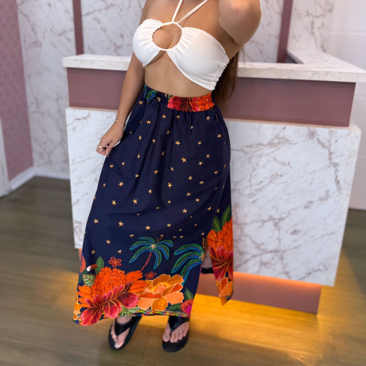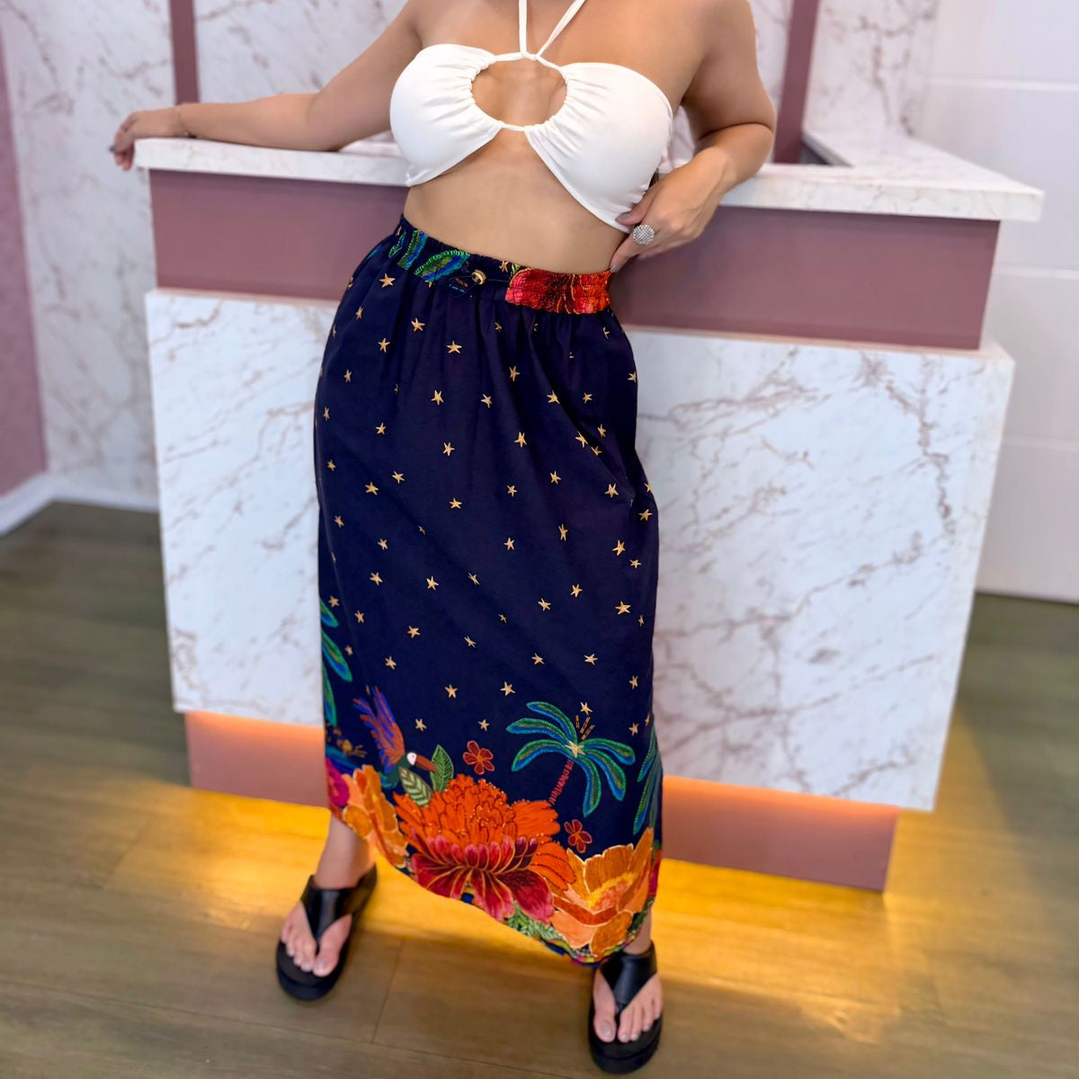 Descubra a beleza da saia longa! Com um design incrível, esta saia longa linda é a peça perfeita para adicionar elegância ao seu guarda-roupa. Seu estilo azul marinho complementado com um toque de laranja oferece um visual único e sofisticado.