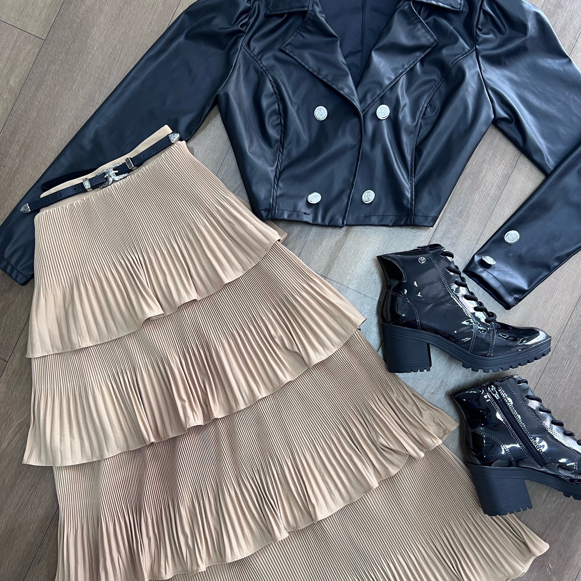 Saia mídi plissada 4 camadas cor nude