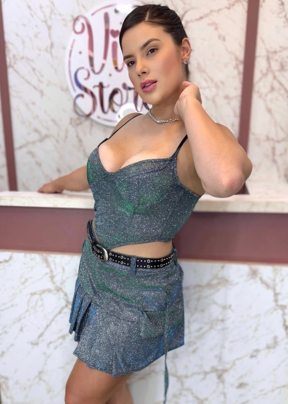 Saia plissada com brilho sofisticado, perfeita para quem busca elegância com um toque moderno. Confeccionada em tecido leve e fluido, possui acabamento levemente cintilante que reflete a luz de forma delicada, criando um efeito luminoso e glamouroso. O design plissado garante movimento e leveza a cada passo, enquanto o caimento impecável valoriza a silhueta. Versátil, pode ser usada tanto em produções mais casuais quanto em looks noturnos, elevando qualquer composição com charme e sofisticação.